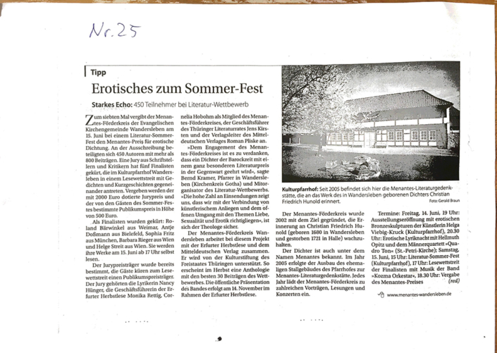 Menantes-Literaturpreis. Bericht in der Mitteldeutschen Kirchenzeitung